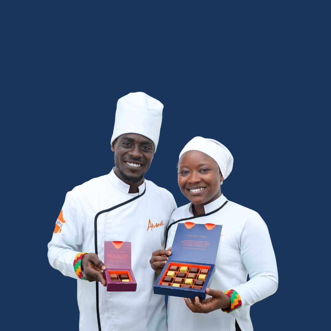 Unsere veganen Pralinen werden in unserer Chocolaterie Schule in Ghana produziert. So schaffen wir im Ursprungsland neue Ausbilungs- und Arbeitsplätze. Denn das gesamte Schokoladen-Know-How wird mit Unterstützung von europäischen Chocolatiers dorthin verlegt, wo die Schokolade auch herkommt. Anders als bei anderen Schokoladenherstellern können wir somit einen enormen und wichtigen Teil der Wertschöpfung in Ghana lassen.